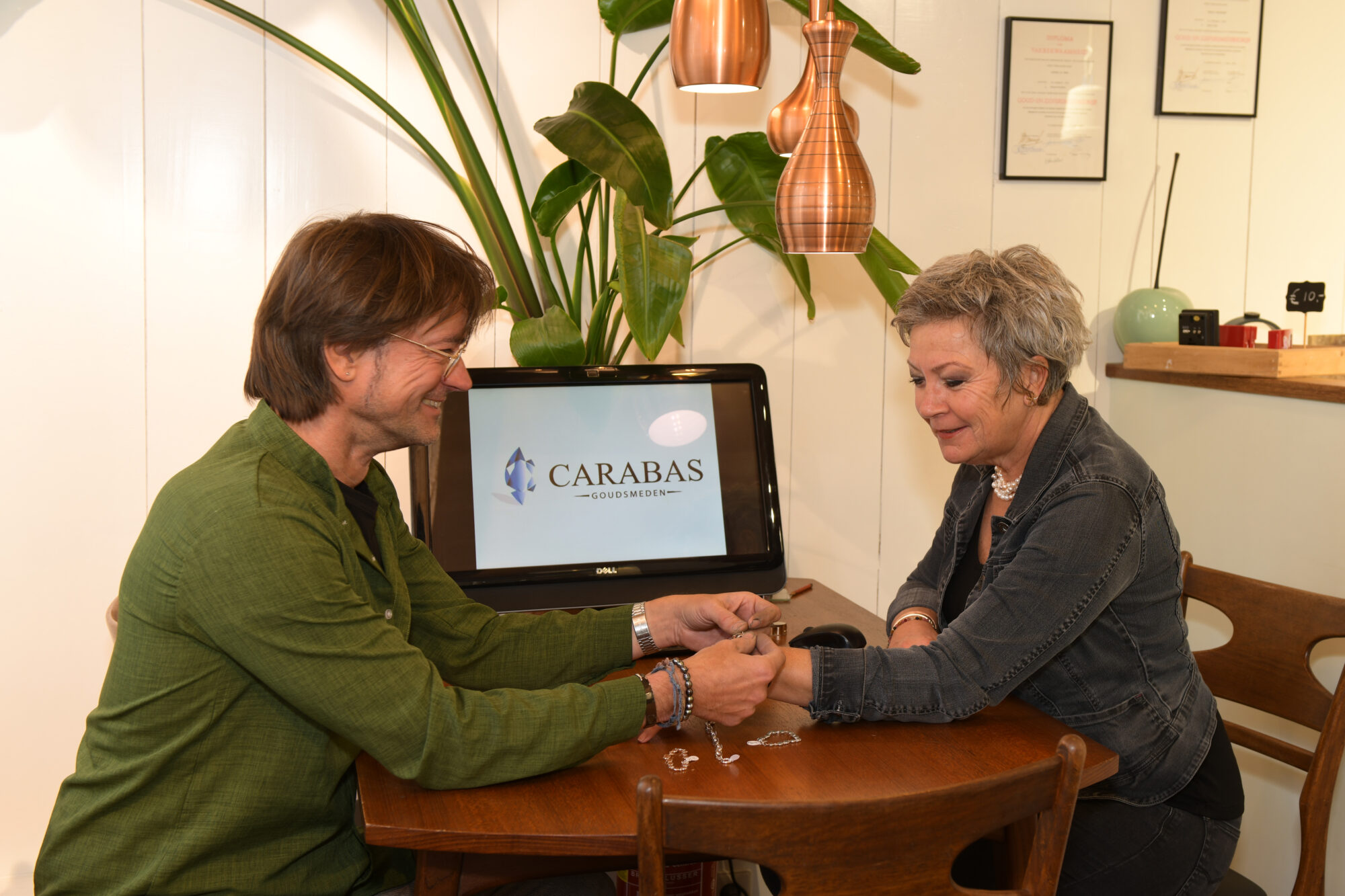 Bij ons aan tafel worden de reparaties aangenomen, wensen voor nieuw te maken sieraden besproken en kunnen in de vitrines en etalage sieraden bekeken worden die te koop zijn.