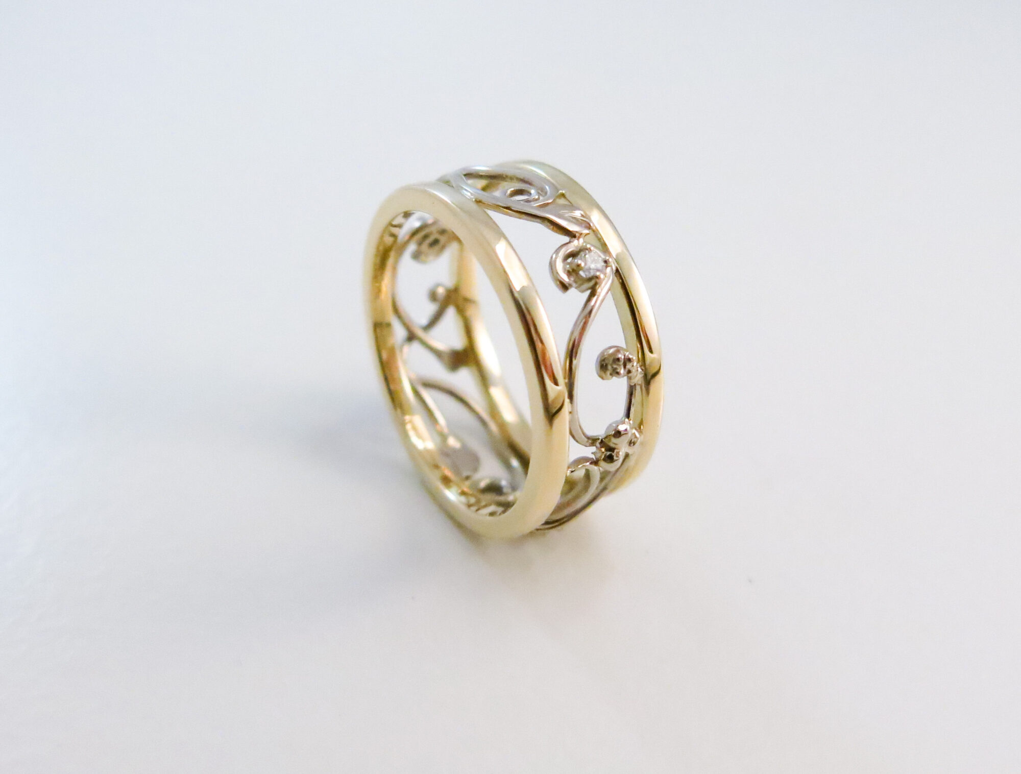 gouden damesring met krullen, bloemen en briljant