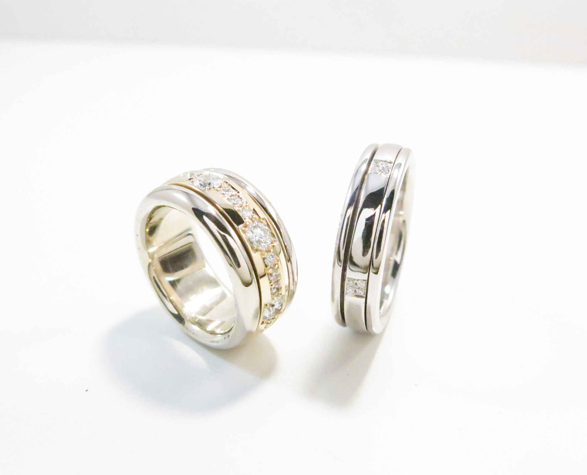 Gouden trouwringen met briljant. Middelste banen met briljant draaien.