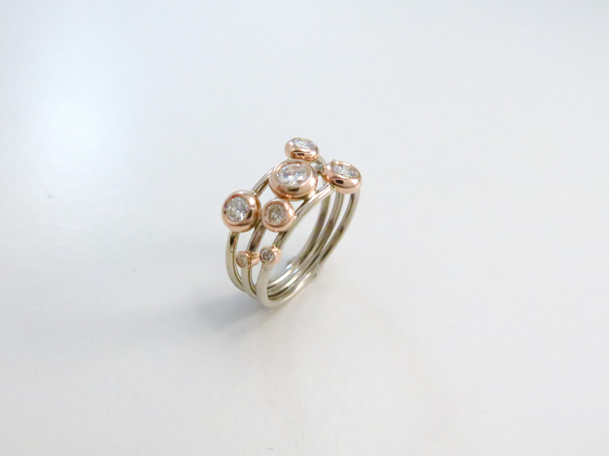 witgouden ring met roodgouden zettingen en briljant
