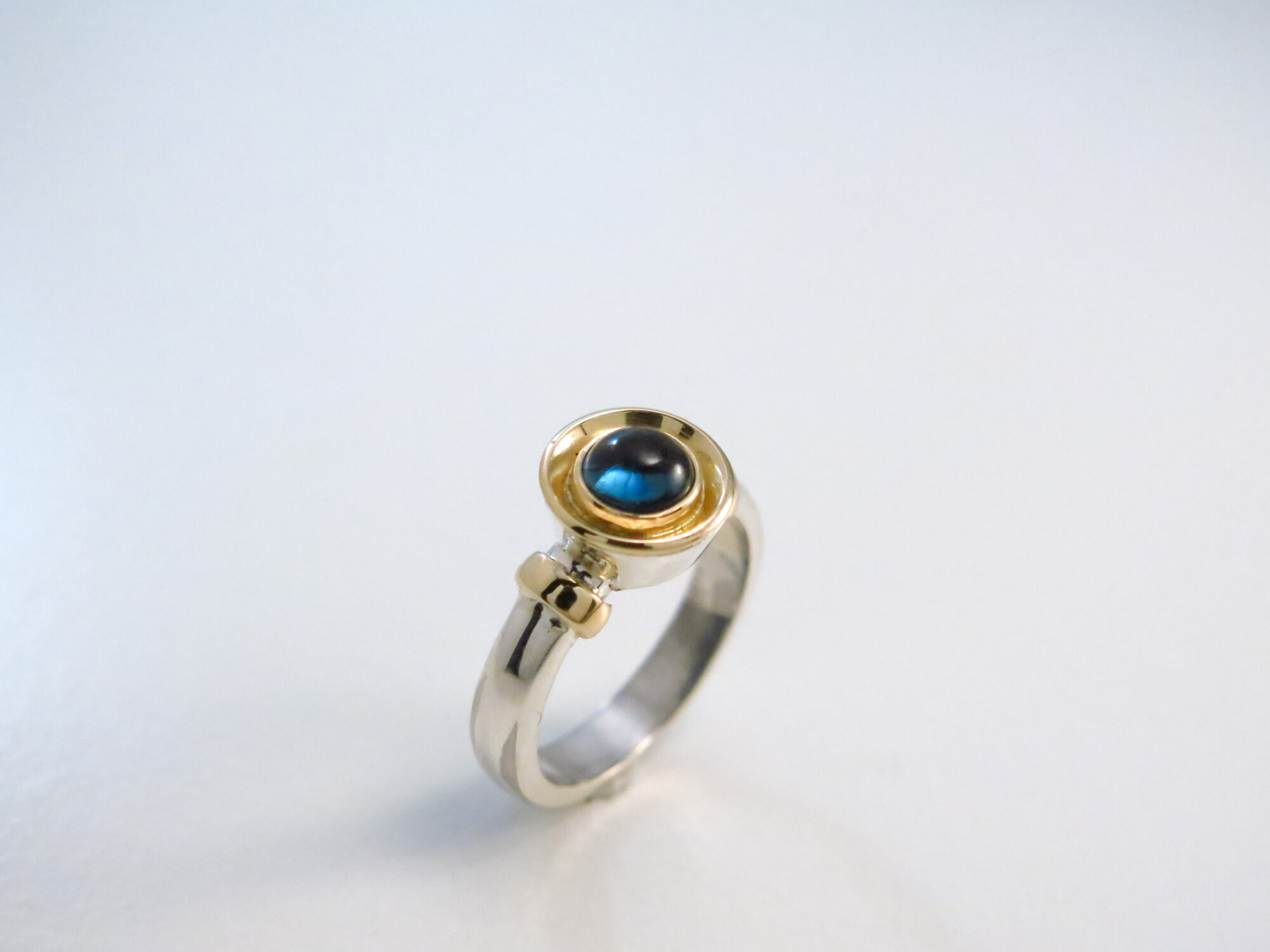 zilver met gouden ring met blauw topaas